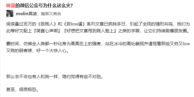 “创系列”消费的是“年轻男孩女孩的青春”,满足的是国内“白幼瘦秀”的审美欲望;“浪姐”也切合了女性们的“非少女感危机”;更早之前的“花少”更是把人际的矛盾点放到台前,满足人们“看戏”的心态……戳中某一情绪点,引爆它,就能让“消费者”如抽鸦片般一边骂一边又忍不住想看。