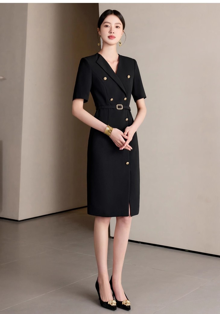 黑色短袖西装连衣裙是一款结合了正式感与女性魅力的单品,