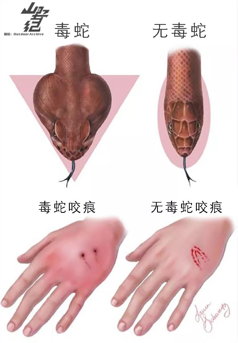观察蛇的牙印,毒蛇咬伤会留下明显的毒牙孔。另外大多数的咬伤是“干咬”,也就是不注入蛇毒、或者没有刺穿皮肤的咬伤。