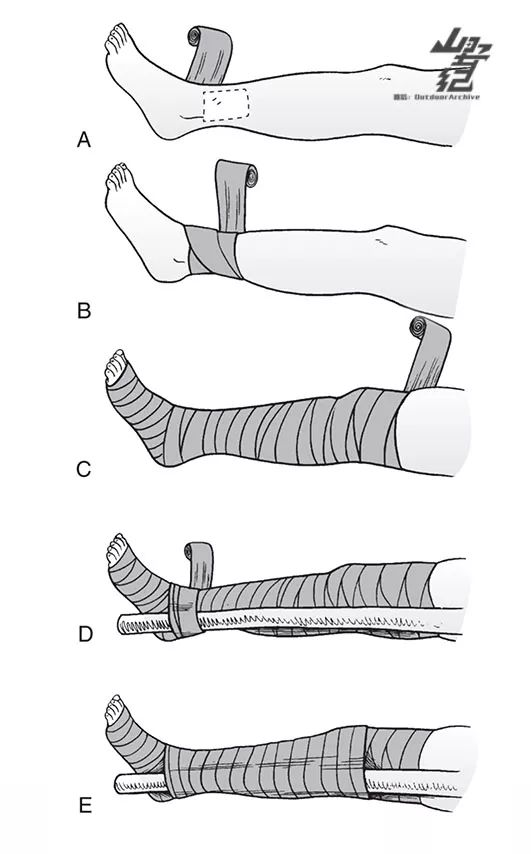 D-E.用把登山杖、树枝等包裹在外面,用来限制肢体运动。