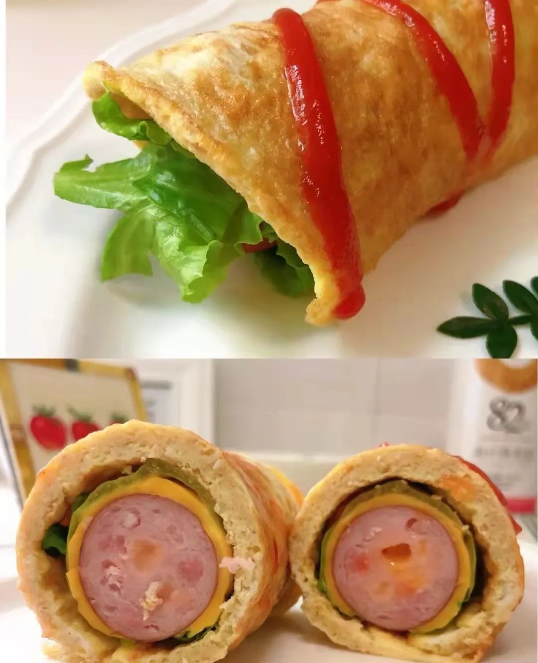 ② 依次铺上生菜叶,芝士片,放入热狗,卷起,表面淋些番茄酱,沙拉酱均可,随个人喜好。