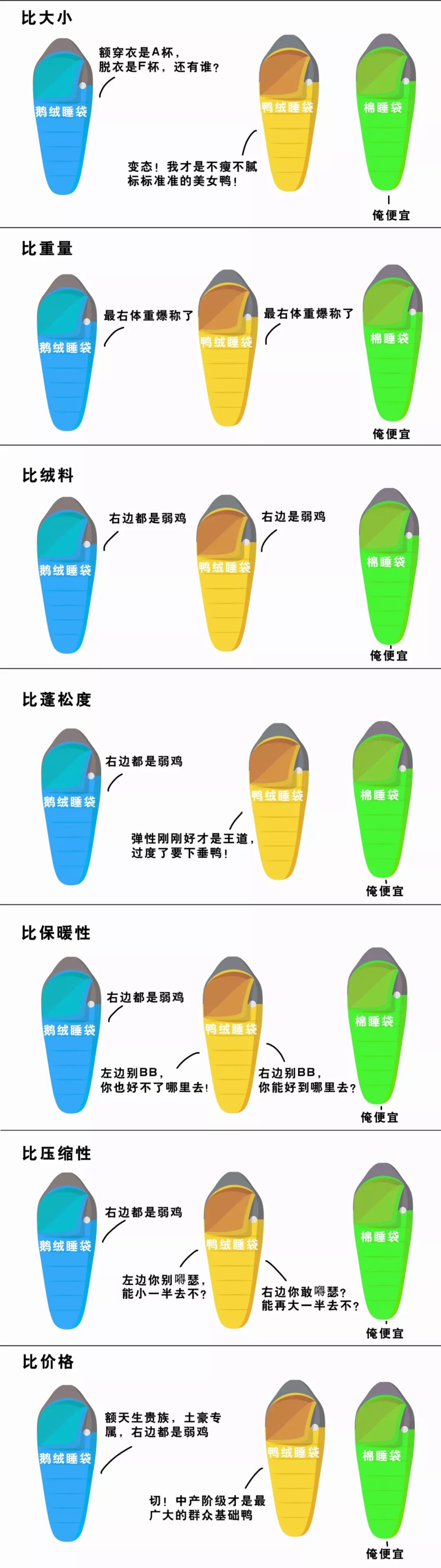 同样的温标,鹅绒睡袋重量最轻、压缩性最好、保暖性最好,一般高海拔登山、极地探险都是采用鹅绒,但价格也最贵,当然,对于土豪来说,这都不叫事儿。