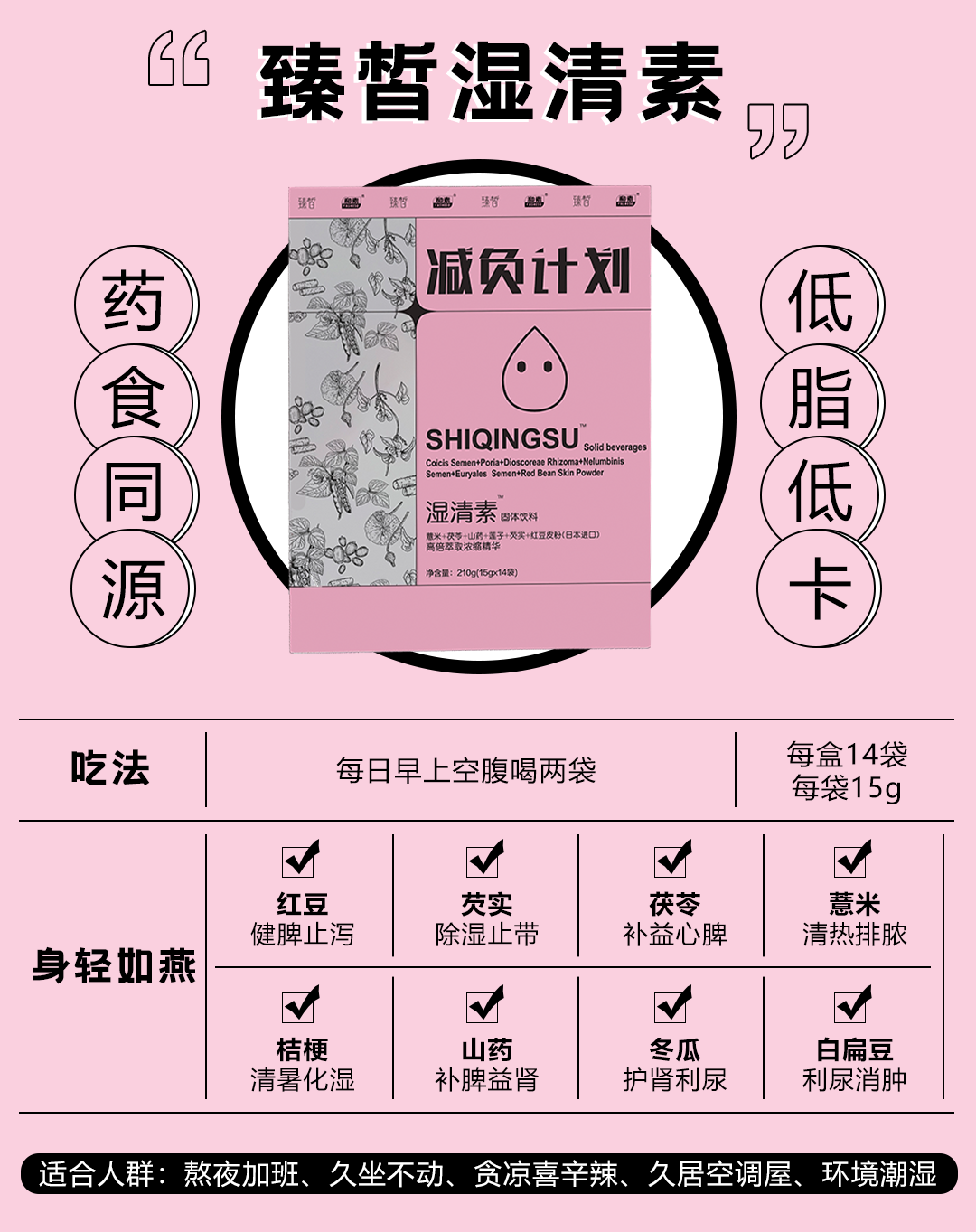 真正从湿气的根源入手,长期调理湿浊体质的真的非常非常少,如果你现在很受湿气困扰,喝臻皙湿清素,再搭配好的生活习惯,效果会比较平稳,「祛湿健脾」+「扶脾肾阳气」+「养血」。