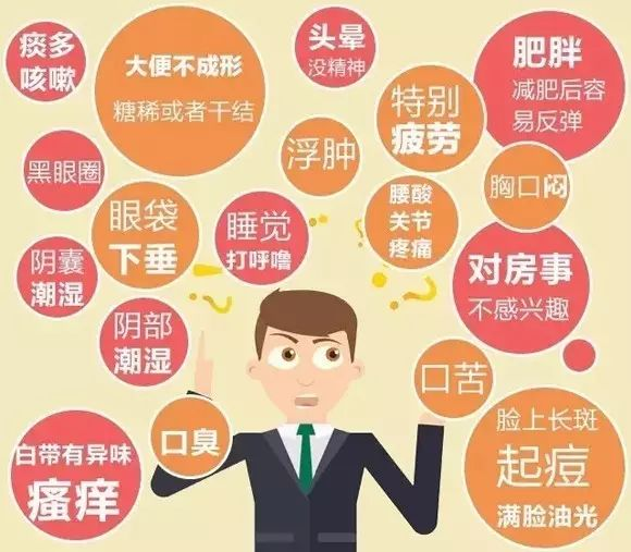 整天没精神、油光满面、爆痘长斑、脸色暗沉、便秘/腹泻、大便粘腻冲不净、舌苔厚腻、手脚冰凉、痛经宫寒、夏天很爱出汗