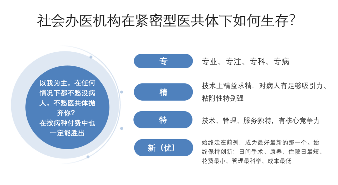 为了确保自身的生存和发展,民营医疗机构在与公立医疗机构紧密合作时,应坚持“以我为主”的态度,保持自身的独立性,明确自身的定位和优势,坚持“专精特优”的发展道路,提高核心竞争力,在按病种付费中定能胜出。