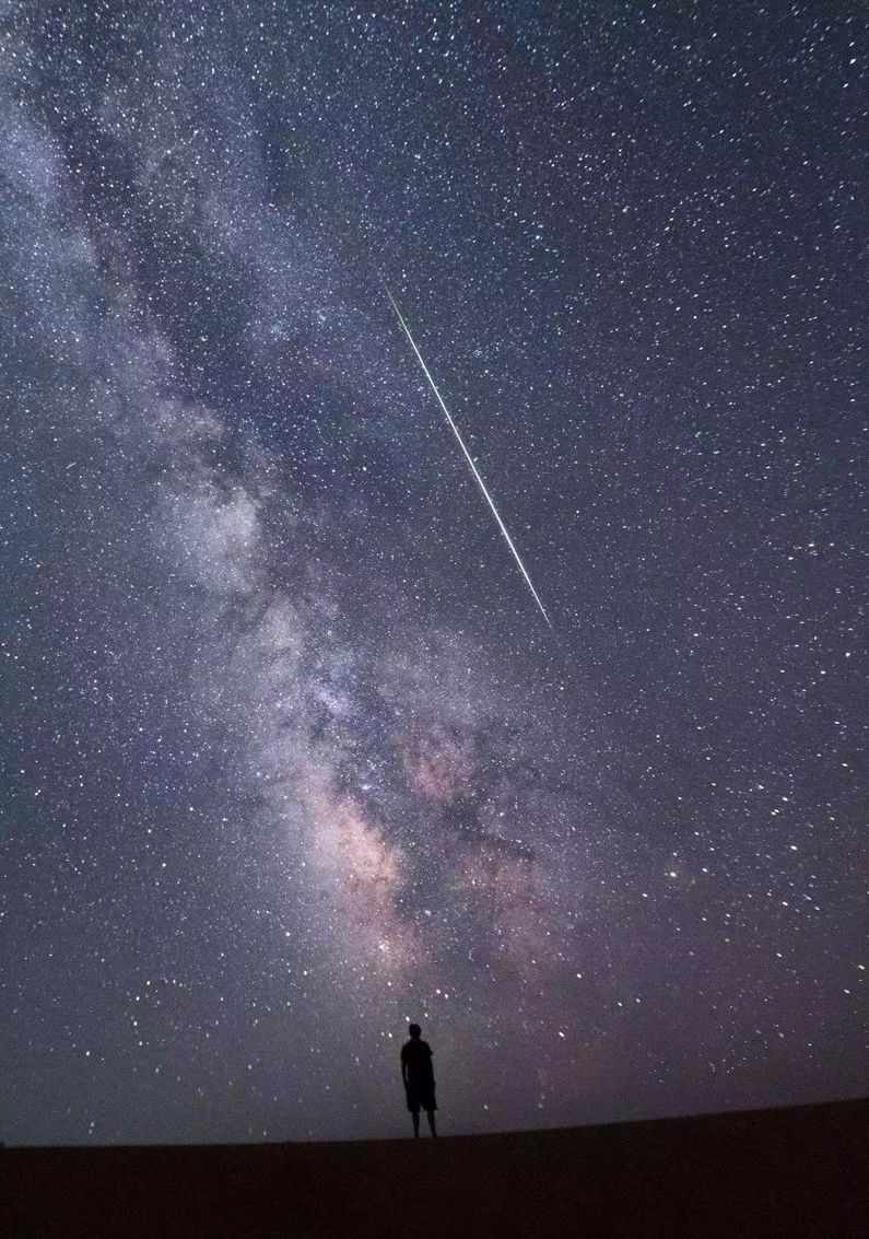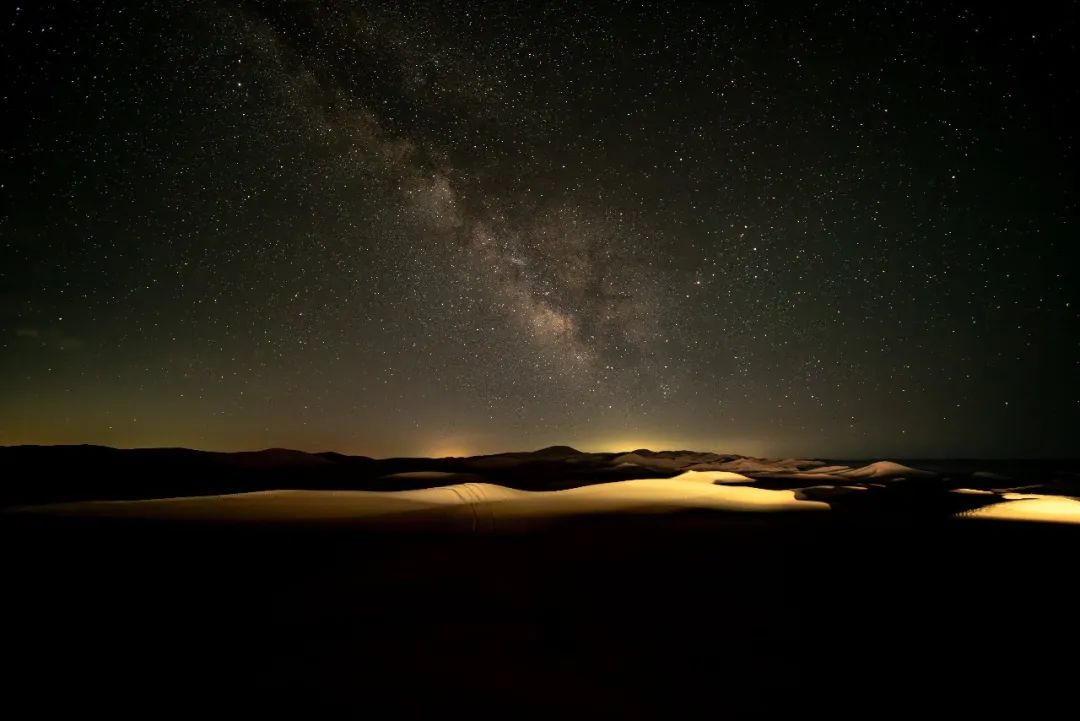 沙漠腹地,四周一片黑,银河高悬于苍穹,好似一道真的拱桥,目光所及是群星闪烁。