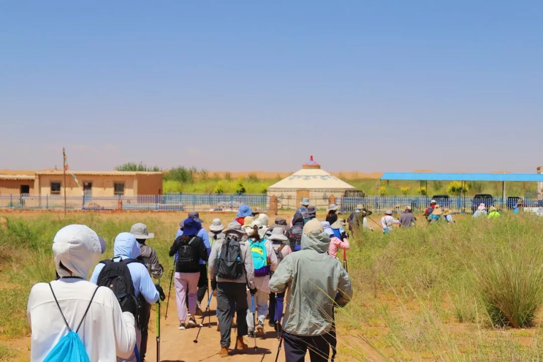 在农家简单用过午餐后,大家很自觉地将全身裹得严严实实,全副武装到牙齿,调整好登山杖长度,带上防晒手套,穿起防沙鞋套,一支 60 余人的队伍浩浩荡荡地,从戈壁,一步步走向前方辽远的沙漠,正式开启了这段为期 3 天远离信号的征途。