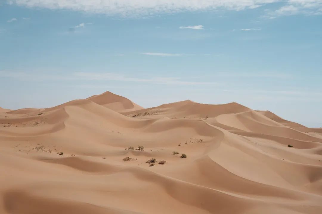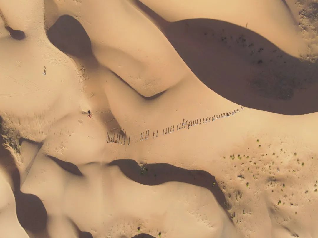 好在,在我们到访之前,沙漠罕见地下过一场雨。只需轻轻刨去第一层沙子,便可看到到湿润的褐色土地,水是生命之源,得益于此,沙子没有想象中那么软,爬沙山这一过程也再次降低了些许难度。