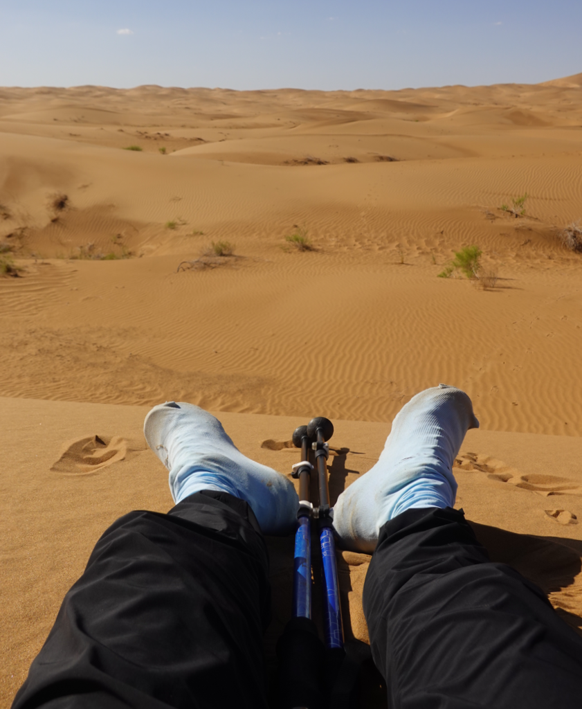 我喜欢脚后跟踩在沙子里,轻松又稳妥,屡试不爽(其实内心很想背一个滑沙板徒步,下坡的时候就可以玩滑沙)。