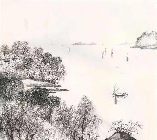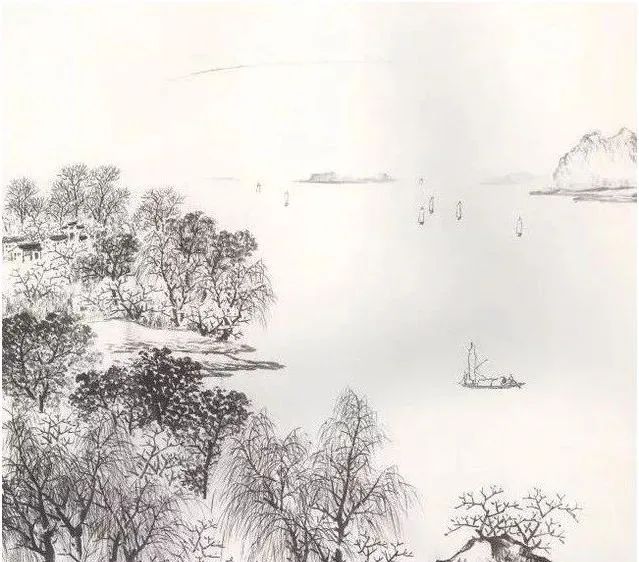 第一步:画出山体之形,树干之形。先画前景的柳树、桃树,再画中景的土坡、柳树、杂树,最后是远景的小村庄、树木、远山以及水面上行驶的小船、帆影。