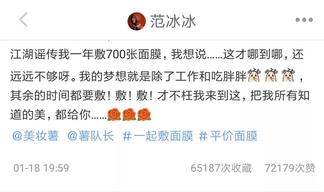 而且大家都知道范冰冰是面膜狂人,最近她亲自在某美妆平台上说过,“每次买面膜都是30-50盒的囤,一年700张都是远远不够的哦”↓