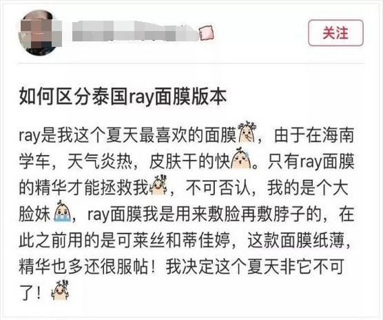 RAY是泰国土生土长的品牌,创立于2014年,因为卖得太火,所以网上出现了非常多的盗版。某宝上代购也很多,但假货泛滥得非常厉害,用劣质面膜=烂脸,必须谨慎。