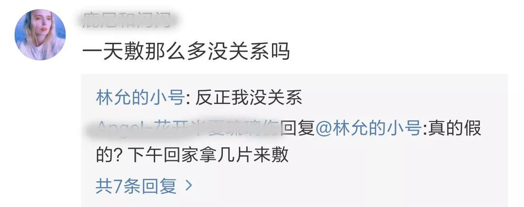 林允曾在采访中说:“出去拍戏的时候,起码要有一箱子面膜囤在剧组我才安心,如果它变成半箱了我会立刻再买半箱来把它补上”。看到她狂敷面膜,吃瓜群众也是操碎了心,有人问敷那么多真的没事吗?她回复:反正我没关系。