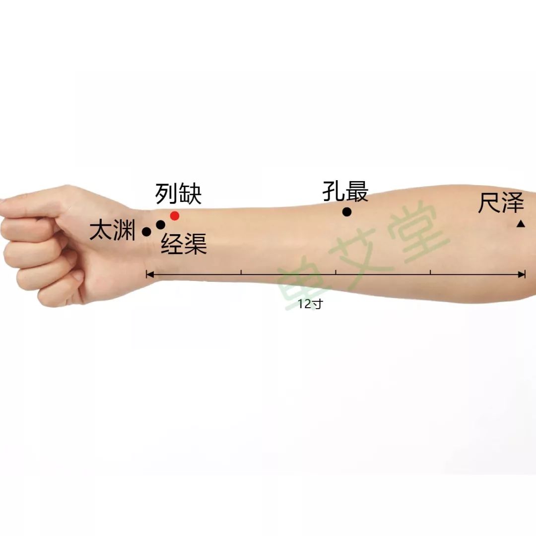 列缺穴很好找,在桡骨茎突上方,腕横纹上1.5寸。取穴时两手虎口交叉,当食指尖所到凹陷处,便是该穴。用列缺穴的手法主要是弹拨。