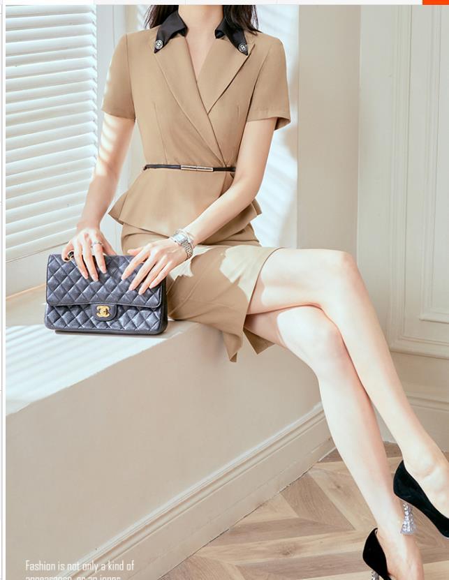 今天安利的这款法式假两件卡其色西装裙,