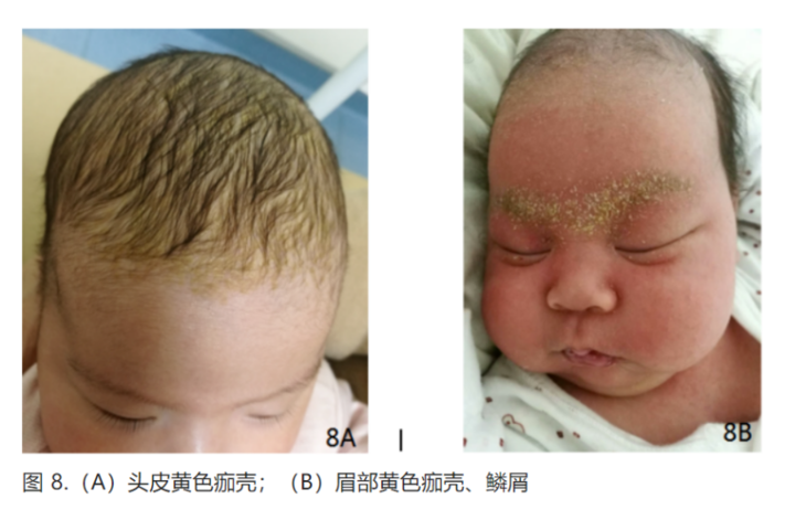 在出生后第 1 月发病,好发于头皮、眉区、鼻唇沟,油腻性黄色痂壳或鳞屑,具有自限性(图 8A,图 8B),少数可继发真菌或细菌感染。