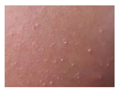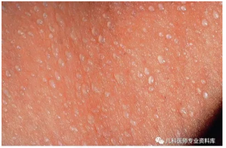晶痱:表现为无症状的,非炎性的,针尖状大小的水疱,疱液清澈,突然出现,弥漫分布在身体大部分区域,水疱消失后出现较硬的鳞屑。