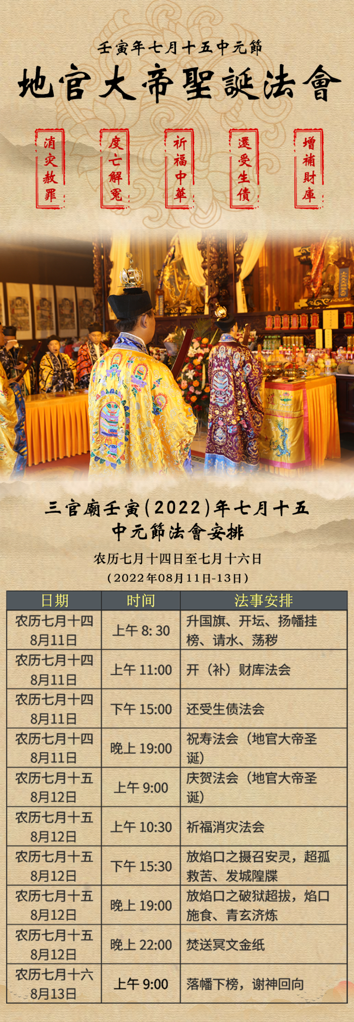 农历七月十五,恭祝中元七炁赦罪地官洞灵青虚大帝圣诞,三官庙祈福消灾、还受生债、增补财库、度亡解冤大法会,共三天。