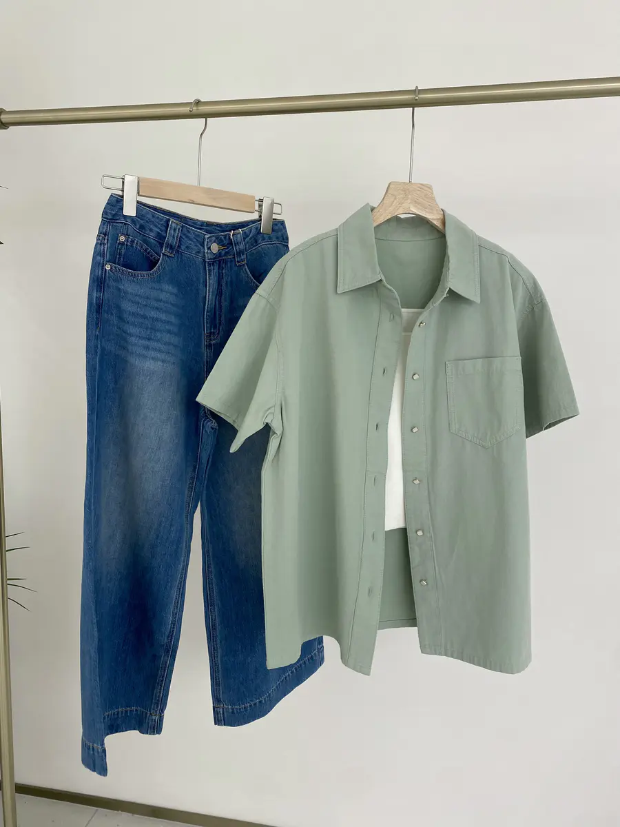 超级好看的牛仔套装,颜色介于苹果绿与豆绿之间,饱和度很低,属于莫兰迪色系,上身超级衬肤色