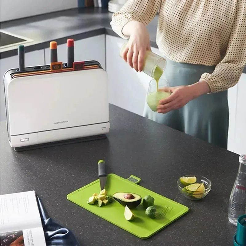 刀锋利,板耐用,拥有果蔬刀&板、熟食刀&板、生鲜刀&板、标配削皮刀,此外,还预留了中式斩切刀口,家里的菜刀也能轻松消毒!