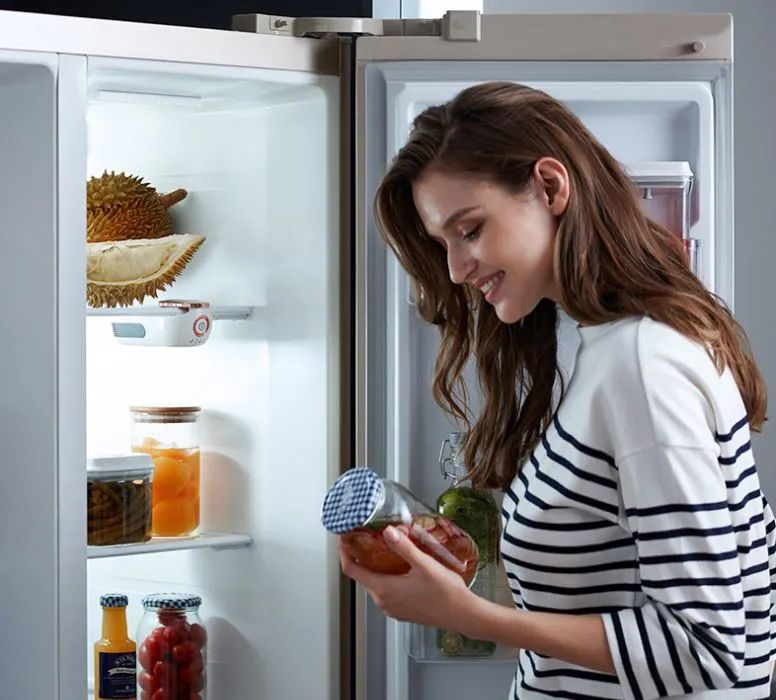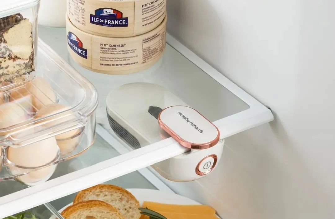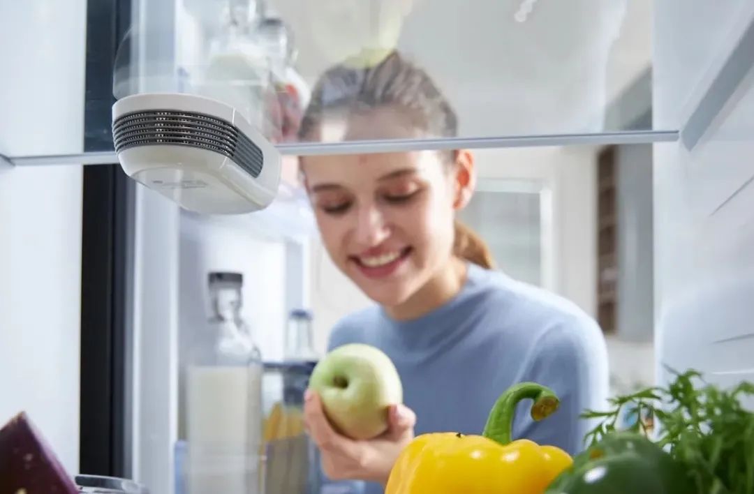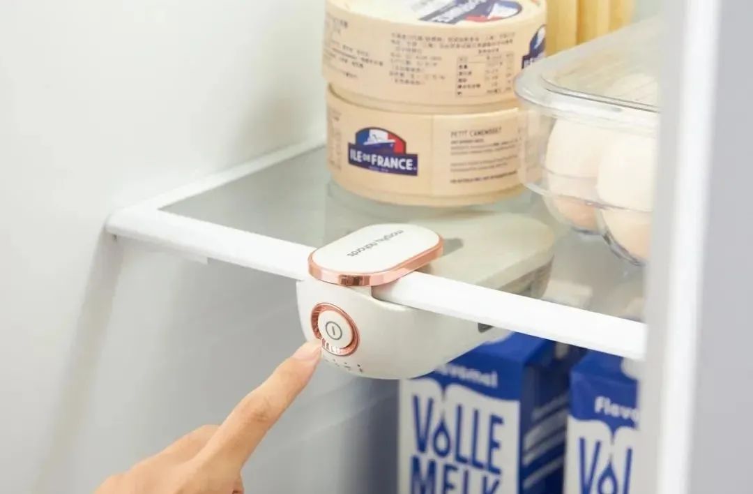 选用摩飞冰箱除味器,可夹在冰箱冷藏室的隔层上。按下开关后,会持续释放定量臭氧。