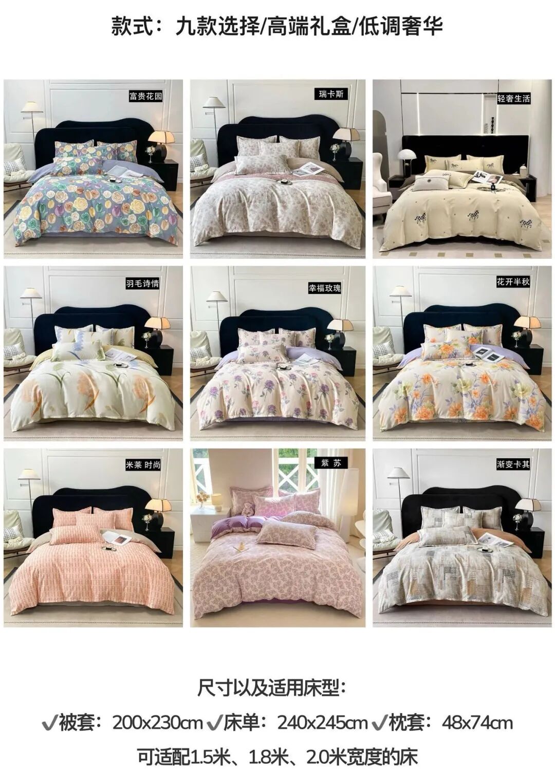 ✔️被套:200x230cm✔️床单:240x245cm✔️枕套:48x74cm