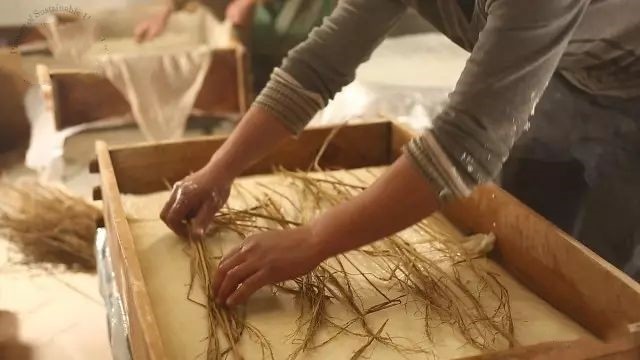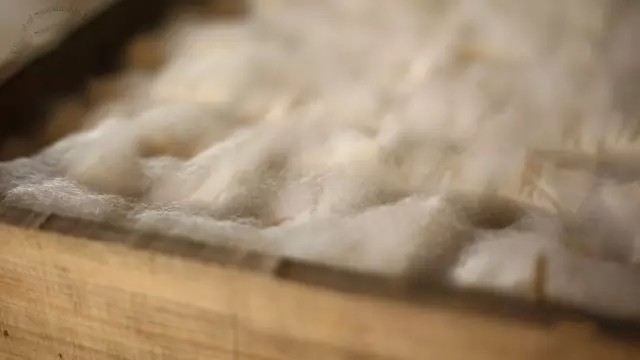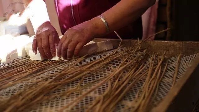 整齐躺在发酵箱里的豆腐胚等着豆腐人掀开草席,为它们一一搓毛翻身,以防菌丝过多粘在一块、破坏了菌膜。一家人,男女老少,手指都巧如织女,来往穿梭宛若施展轻功,翻指之间顺手抹平菌丝,且不伤腐皮。豆腐坯瞬间恢复乳黄本色,整整齐齐躺回了原位,上下左右间距均等,恰巧一指之宽。