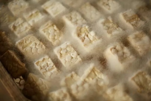 一般的腐乳制作,前期发酵到这里就结束了。此时,据《中国腐乳制造》王瑞芝的实验,豆腐坯中的水溶性蛋白质由原来的3.61%剧增为55.54%,含水量由原来的73%降到64%,氨基酸含量达到0.08%-0.14%,培养氨基酸的工作进行了一半。⑥
