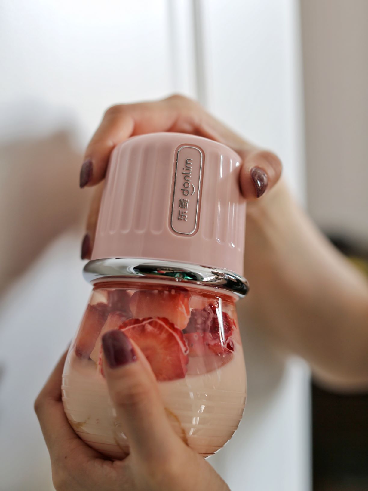 ①将草莓和香蕉混合牛奶放入榨汁杯打成奶昔