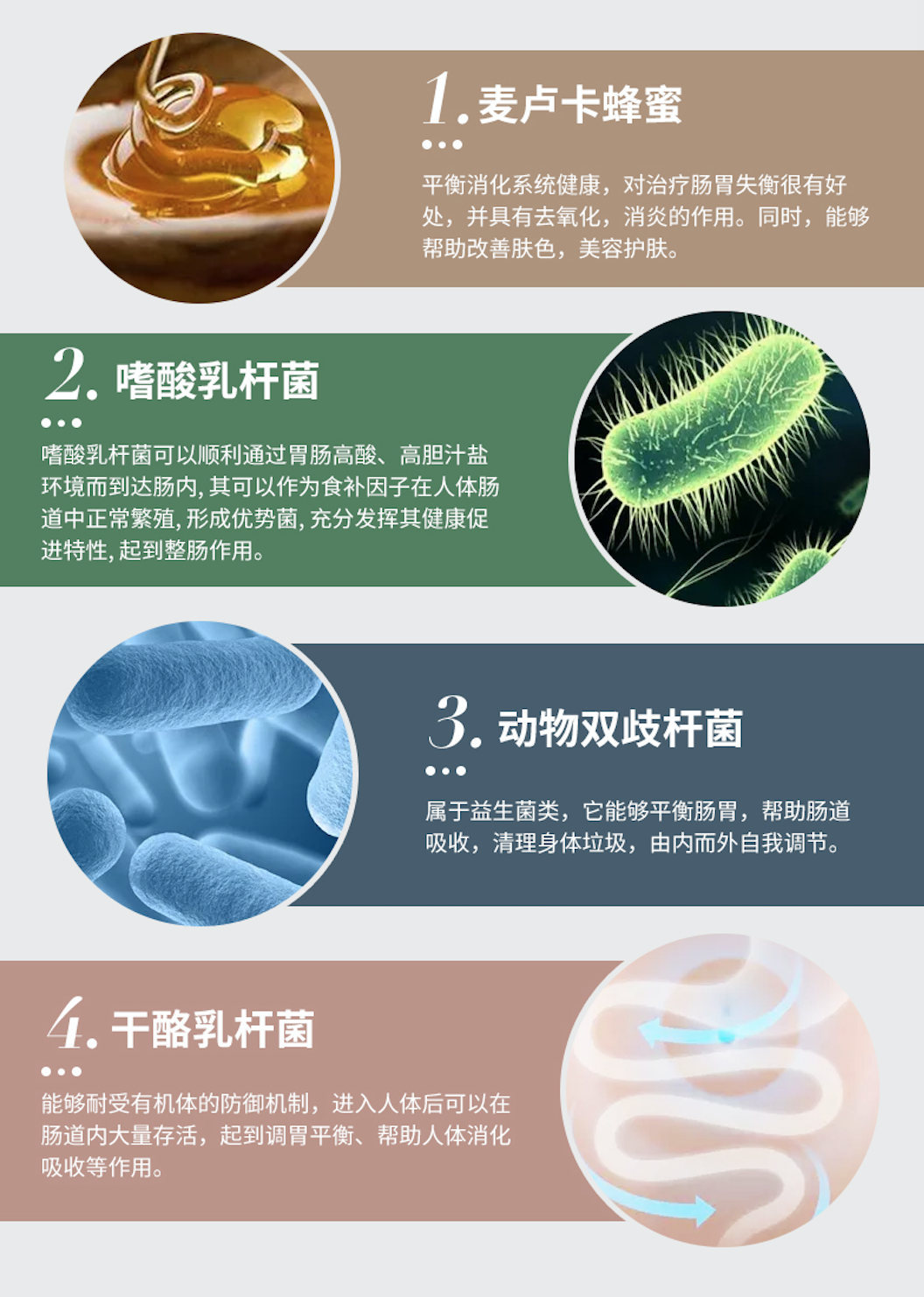 麦卢卡蜂蜜、嗜酸乳杆菌、动物双歧杆菌、干酪乳杆菌
