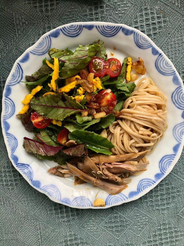 今天是辟谷开始前的最后一天,晚上最后一餐我跟往常一样,吃的比较清淡。用蜂蜜和油醋汁拌了个沙拉,配一些鸡丝凉面。说是凉面,也就是用凉白开过一下到室温。儿子拍的照片比较好看,说了教我总是学不会。