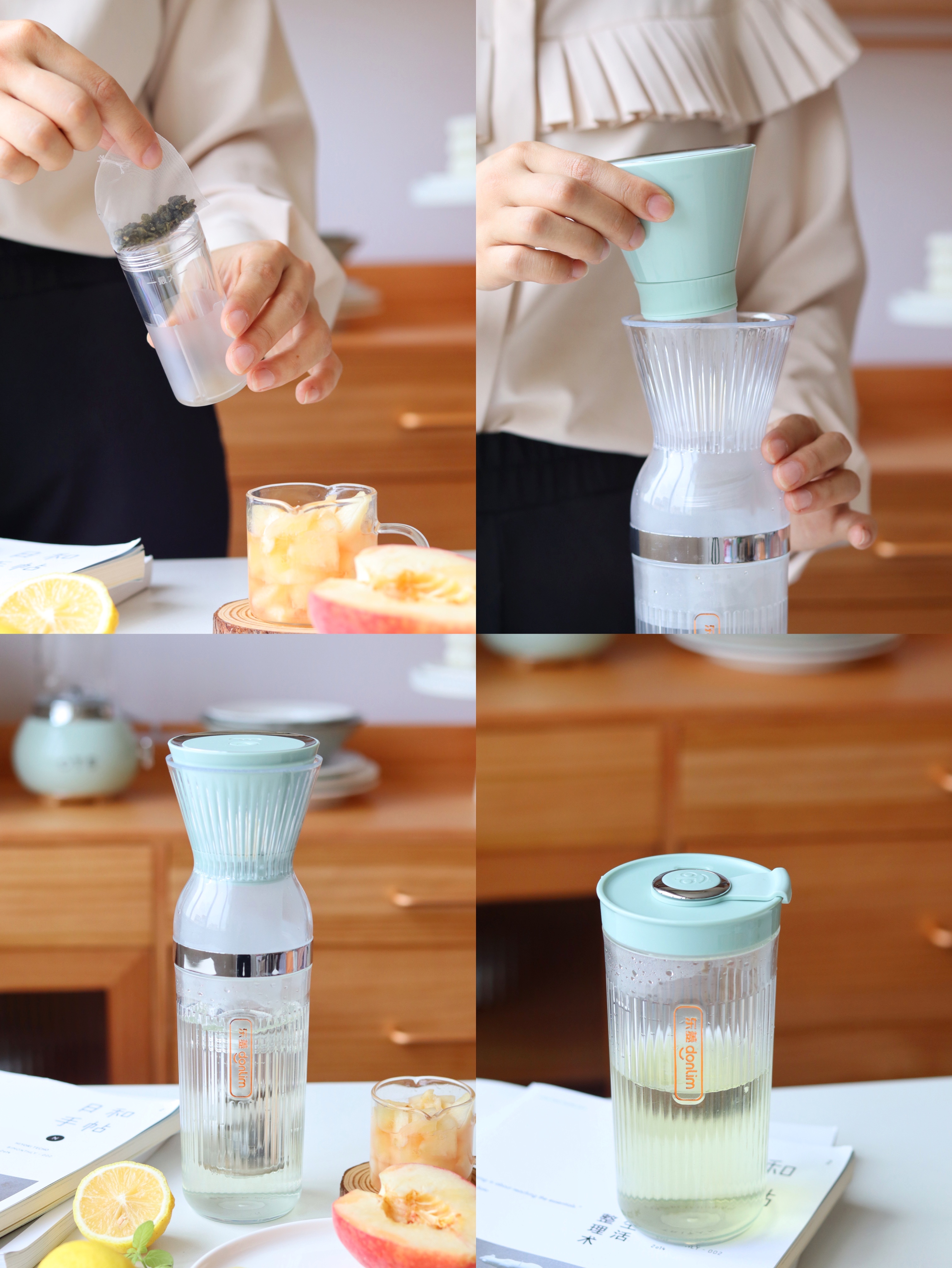 1.首先用东菱乐萃杯来做一杯冷泡茶,只需把茶包放入萃取杯中,倒入凉白开启动按钮即可。