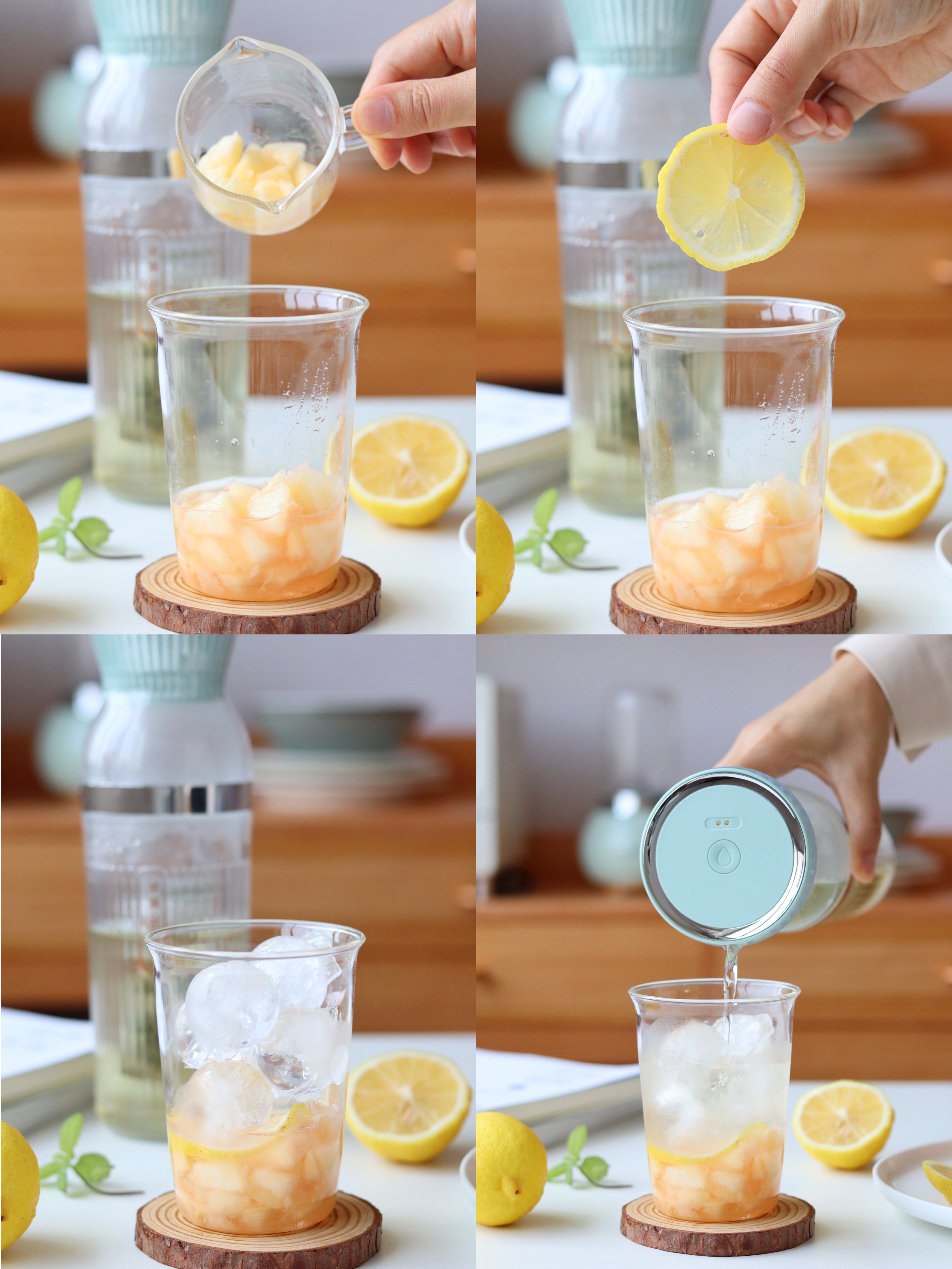 4.杯中倒入蜜桃酱,再放入柠檬片,放入冰块,再倒入冷萃好的茶饮和薄荷即可。
