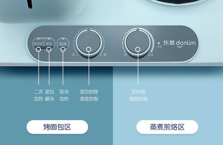 东菱早餐机分为两个区域,左边吐司机,右侧蒸、煮、煎、烙区。