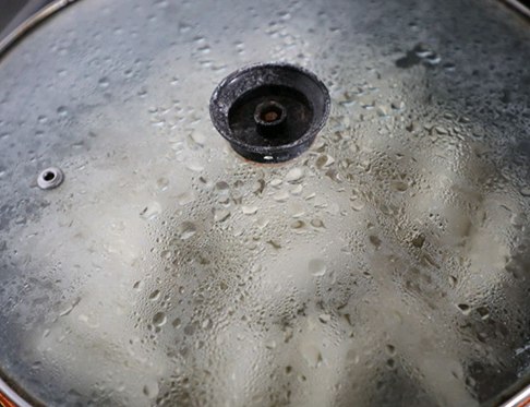 3、待锅贴底部煎成金黄色,顺着锅边倒入半碗水(吃饭小碗),盖上锅盖,焖制3分钟;