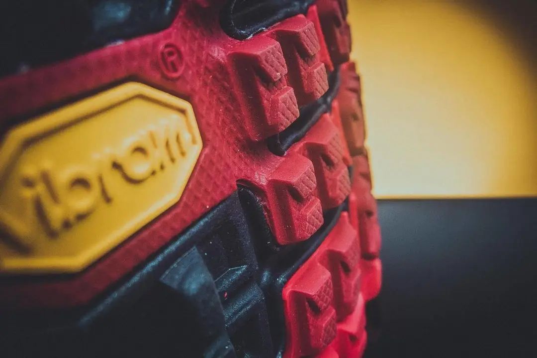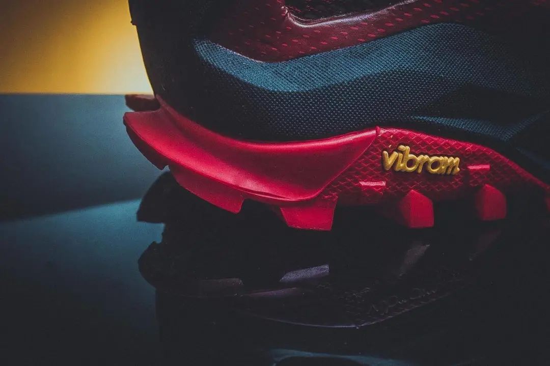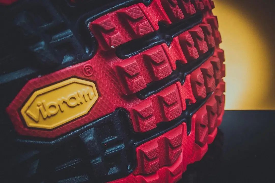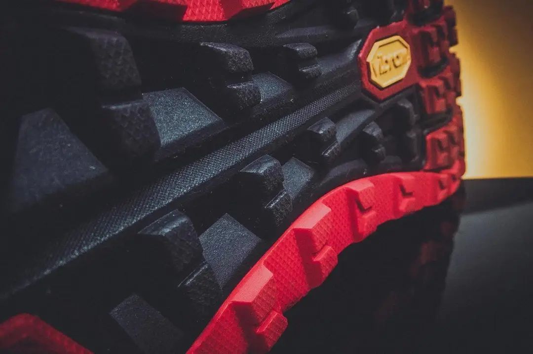 OLYMPUS 4.0依旧是非全掌大底,在损耗高的位置使用红色的VIBRAM MEGAGRIP配方大底,而损耗较低的位置镂空露出黑色的中底,在不降低耐用性的前提下尽最大能力轻量化,大底的耳齿较前几代来说变得更深且更细密,在松软地面会有更好的抓地力。