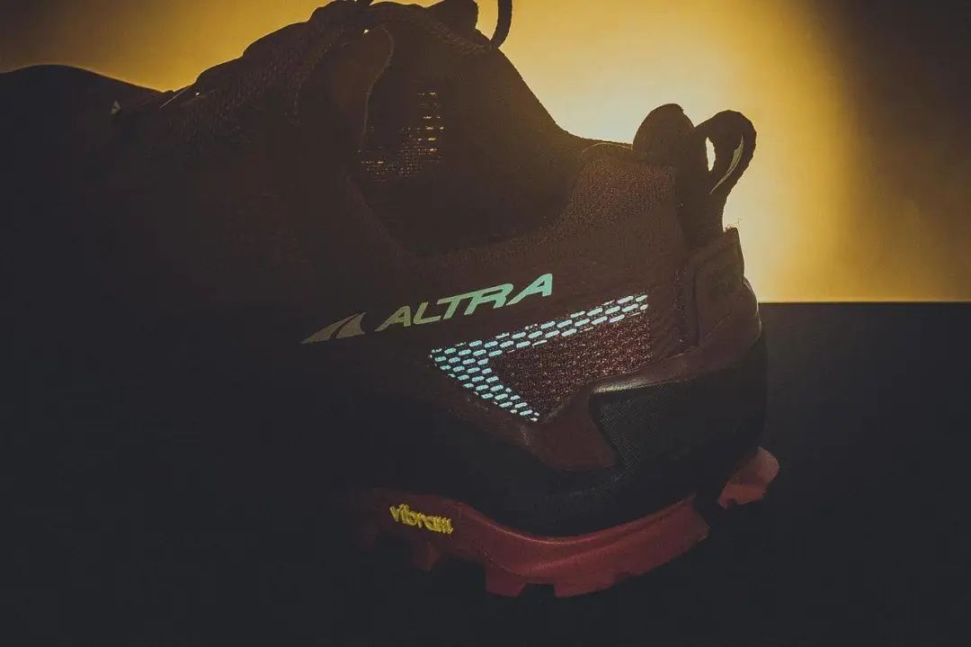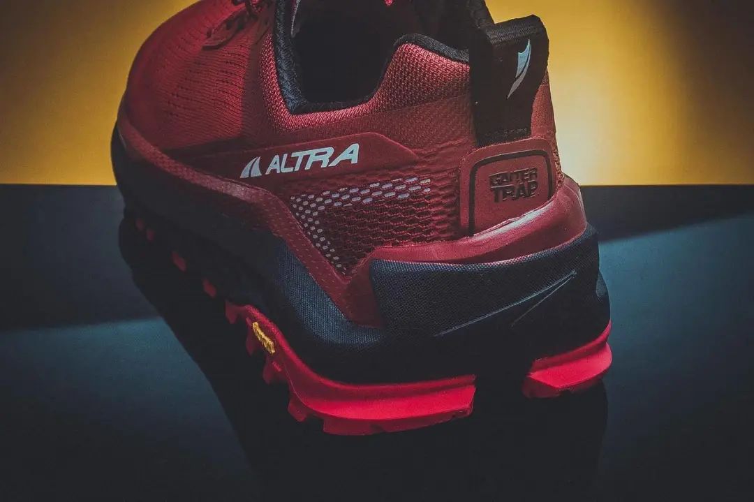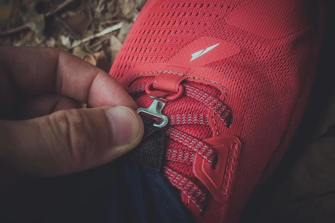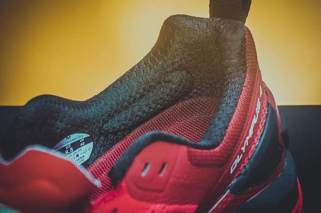 OLYMPUS 4.0后跟设计了织带提环和防沙套固定系统Gaiter Trap,配合鞋带孔前端的金属环可安装ALTRA自家的防沙套,跟杯外两侧加入了反光材料来增加夜间被动可视度。
