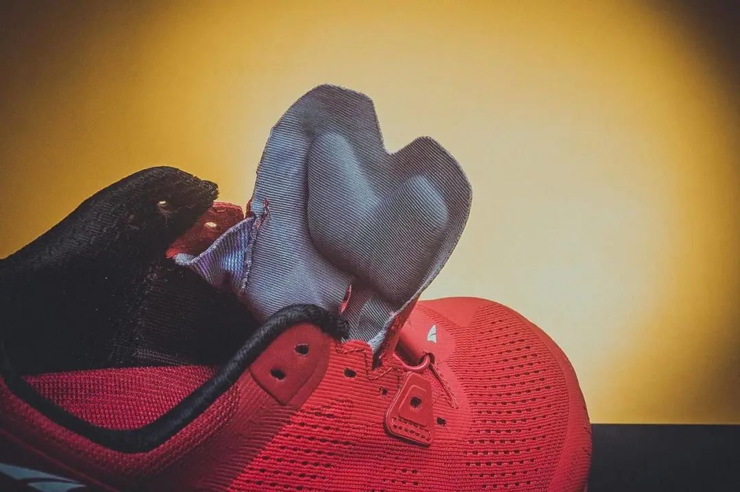 跟杯内夹有港宝进行支撑,鞋口使用了蜂窝格纹理的里料,并用海绵在跟骨位置制造两个凸起,用以锁定足跟。