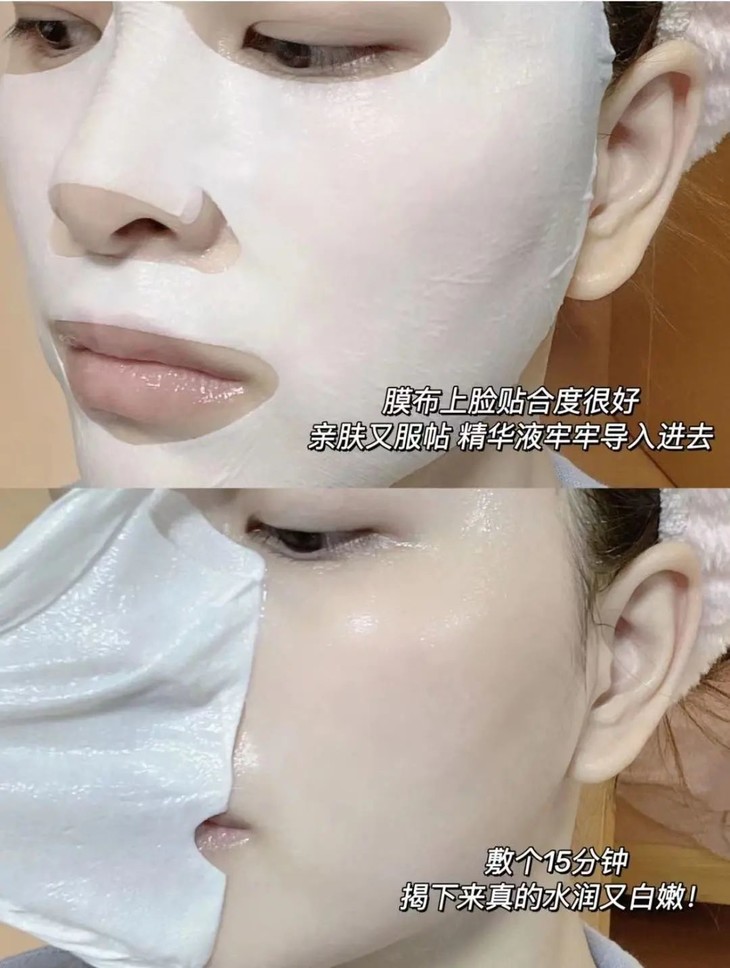 不仅是功效好,使用体验也特别好。面膜纸是天然植物天丝膜布,轻薄服帖,贴近于肌肤,贴在脸上服帖到不行!