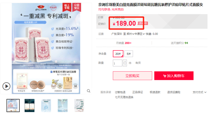 旗舰店189元20片面膜,现在购买直降90元,99元20片,想要美白或者家里没有面膜的姐妹们都可以囤一波!