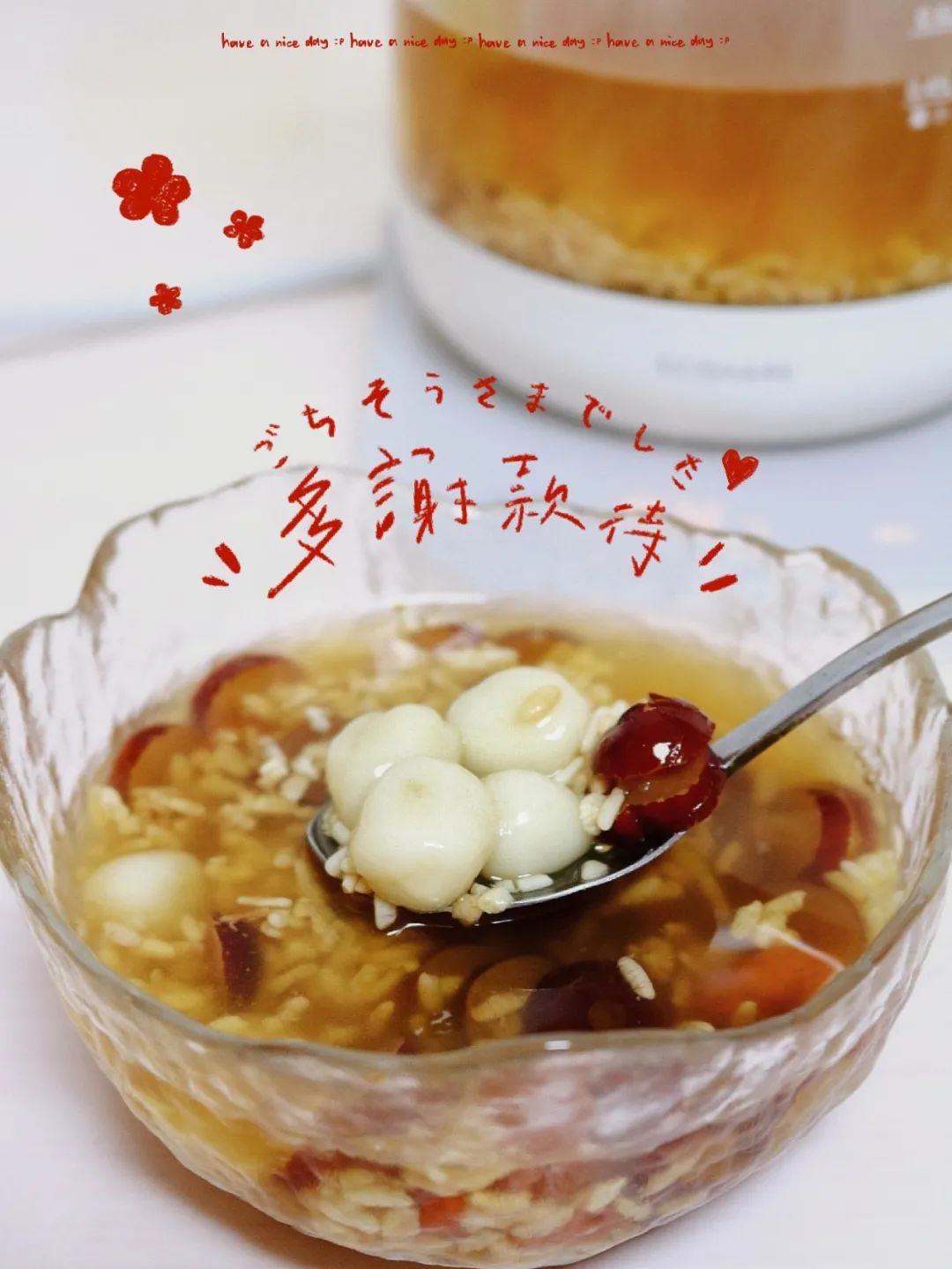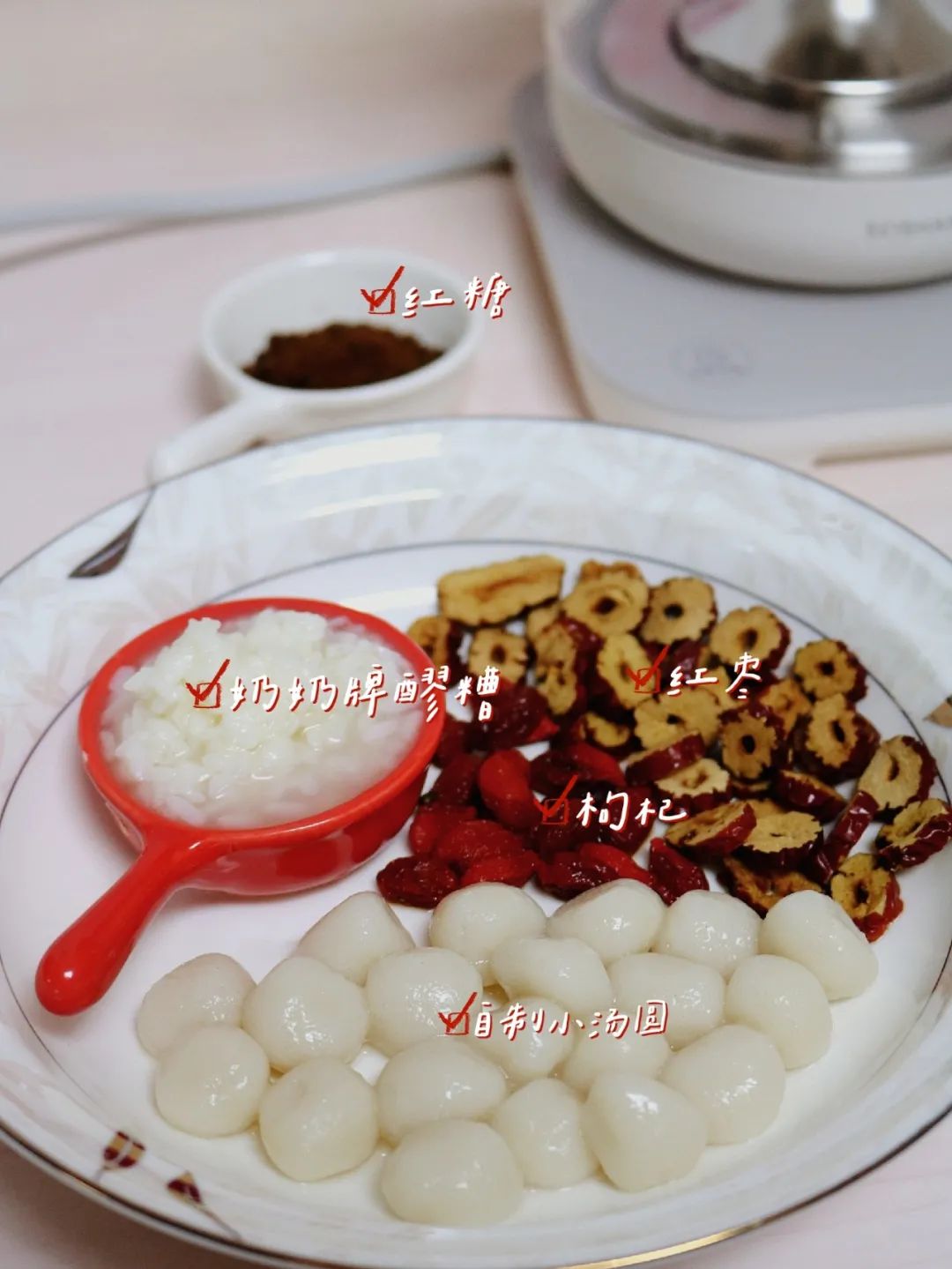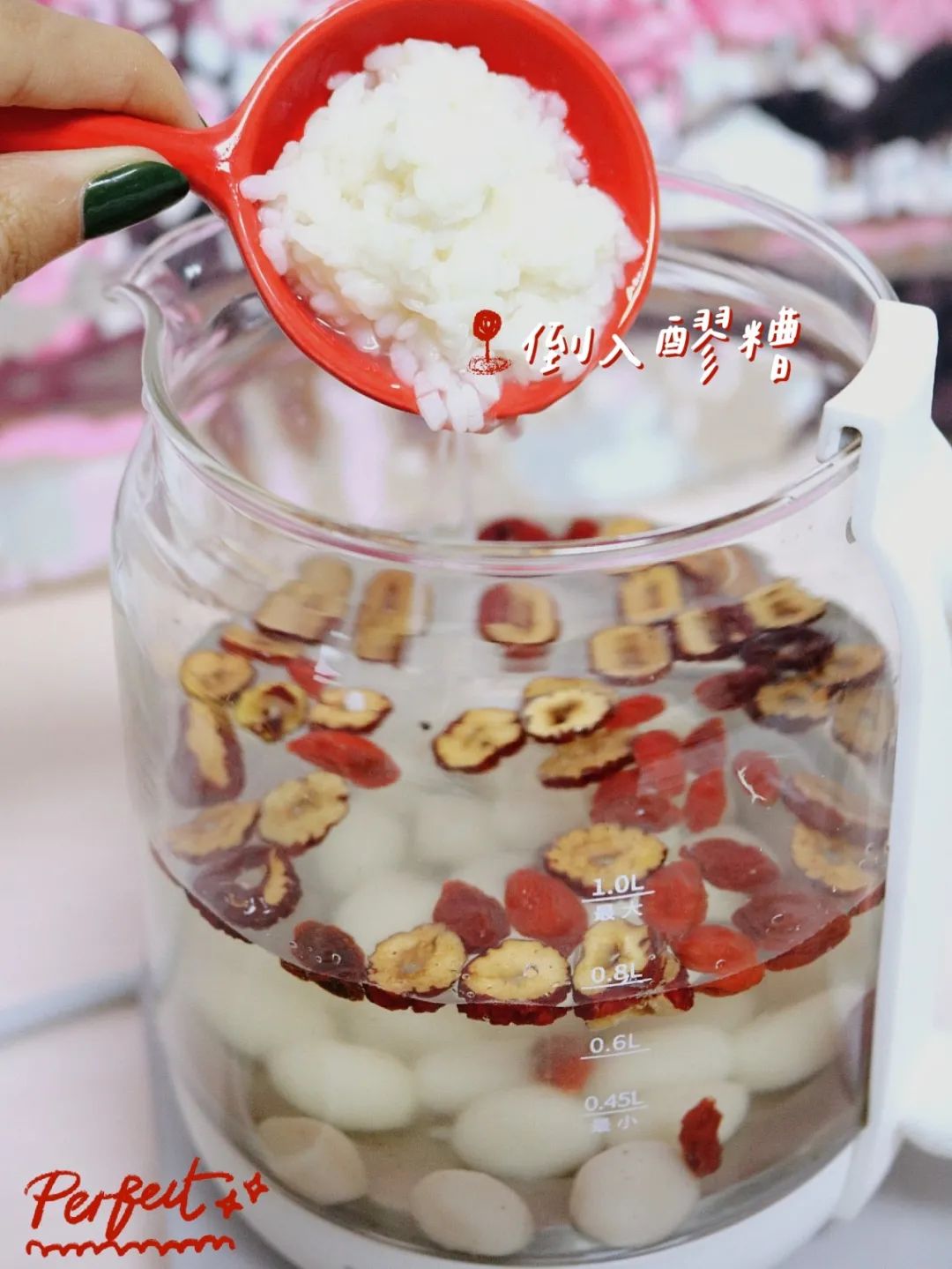 养生壶内倒入600ml饮用水,依次将汤圆、红枣、枸杞、红糖以及醪糟倒入。