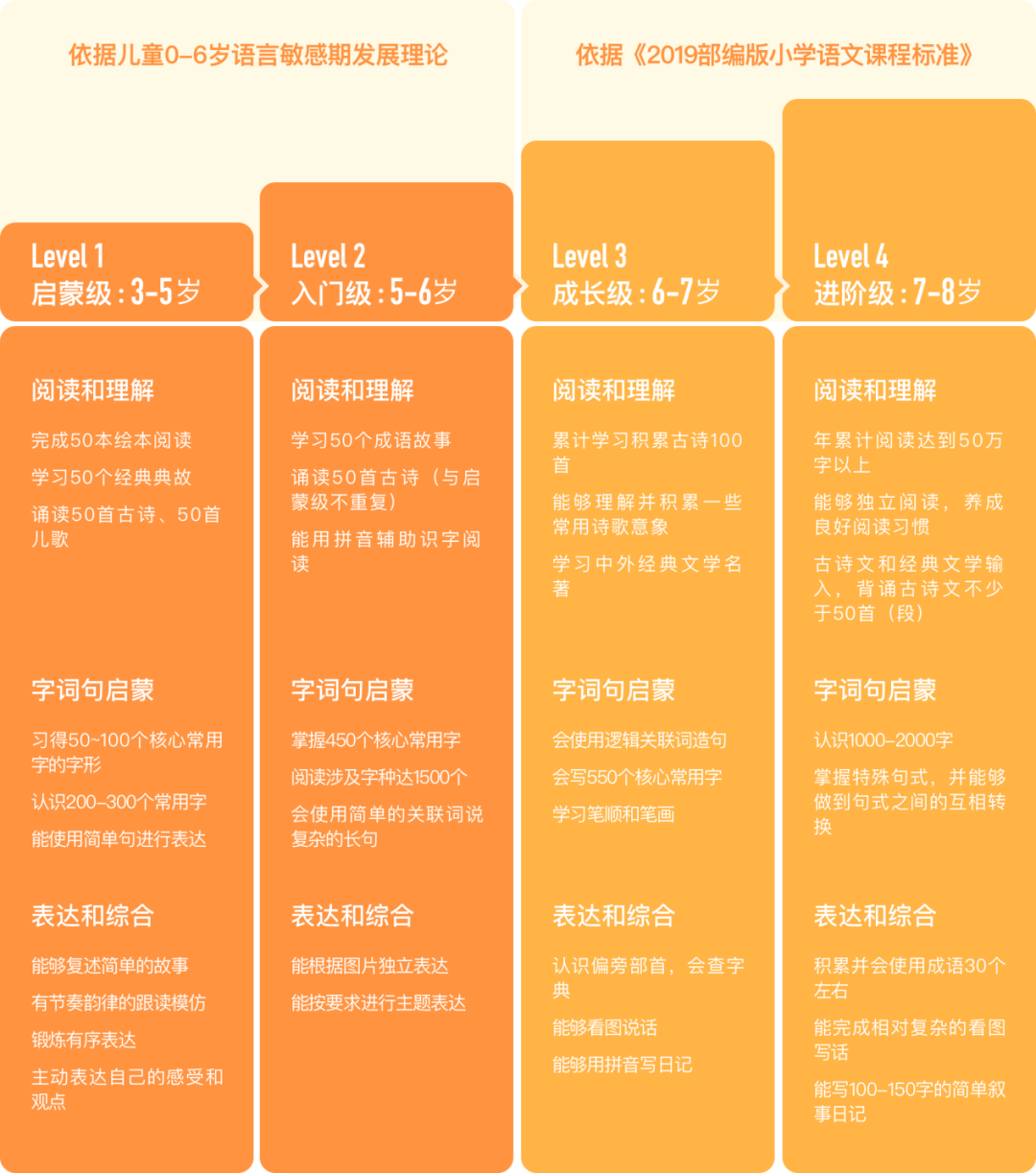 在紧扣大语文基础内容的学习外,小猴语文在幼小衔接方面同样很重视,课研老师们还根据教育部小学语文新课标及部编版教材进行拆解,再结合《3-6岁儿童学习与发展指南》确定了小猴语文的课程目标与知识容量,为孩子进行启蒙的学习和拓展,帮助家长顺利做好幼小衔接。