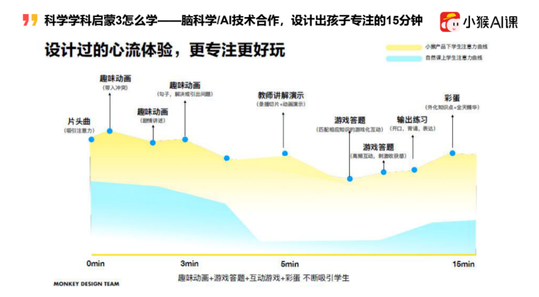 小猴语文15~20分钟的课堂环节,每一分钟都是有设计的。好未来脑科学实验室根据儿童注意力曲线和脑科学依据,为小猴语文设计15~20分钟的课堂环节闭环。