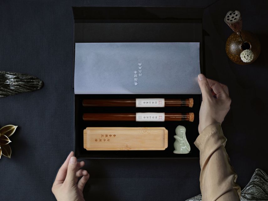 『风』礼盒以“青瓷留香”的诗意场景为主题,重现古人雅致的生活场景。礼盒包含辟温香、睡安香,瓷兔香插和竹香承。