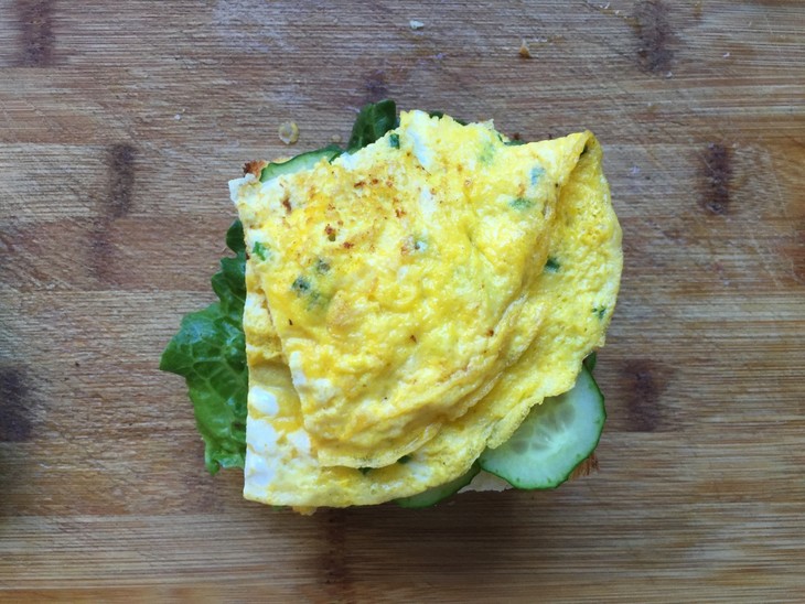 6、生菜洗干净,黄瓜切片,下面放一片吐司,放上生菜叶,鸡蛋,培根,再放上一片吐司,放上黄瓜和鸡蛋,再放上一片生菜,最后再放一片吐司