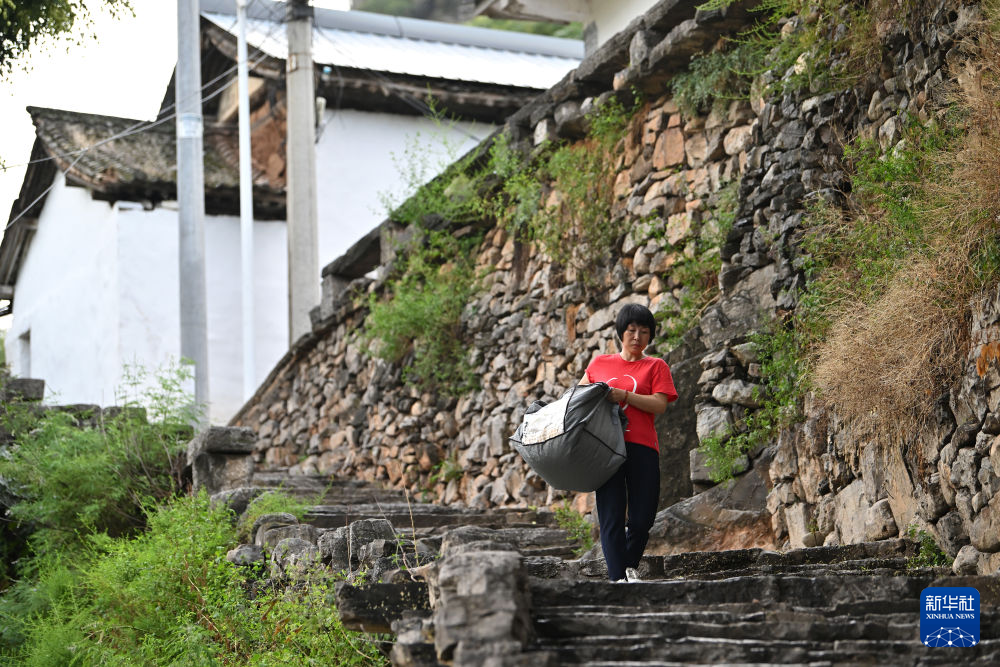 在山西省平顺县榔树园村,魏美玲将民宿里换洗的床单及被套打包准备送去清洗(7月24日摄)。