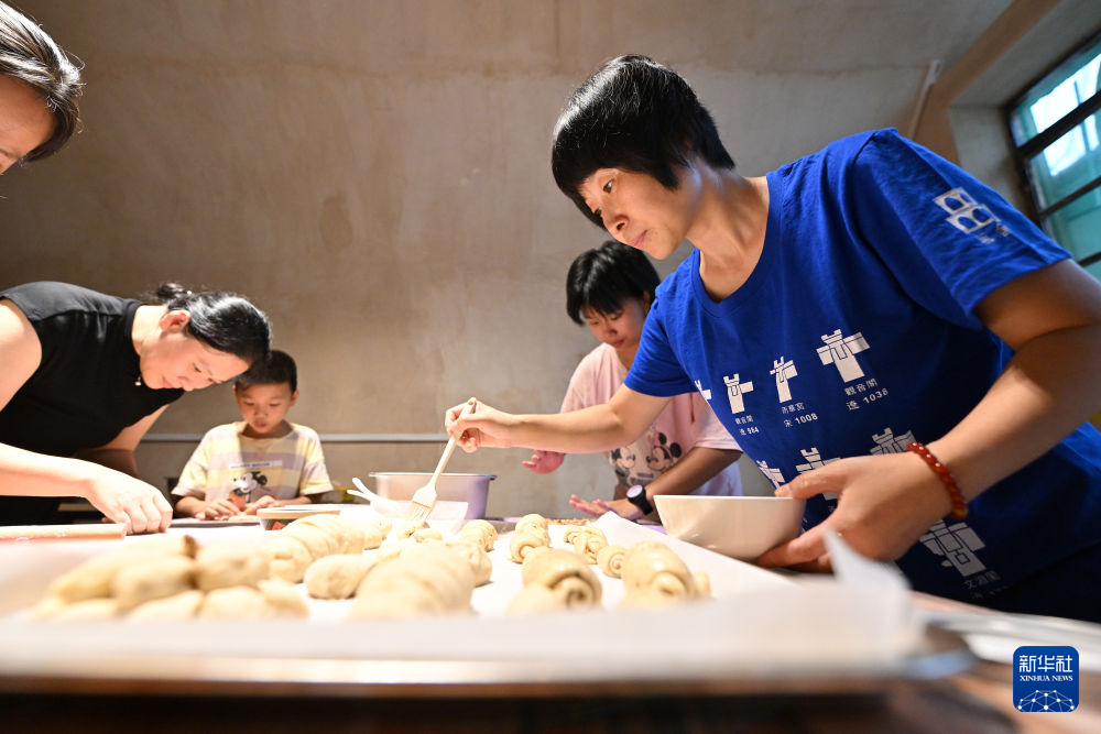 在山西省平顺县榔树园村,魏美玲(右)和住在民宿的客人一起做面包(7月23日摄)。