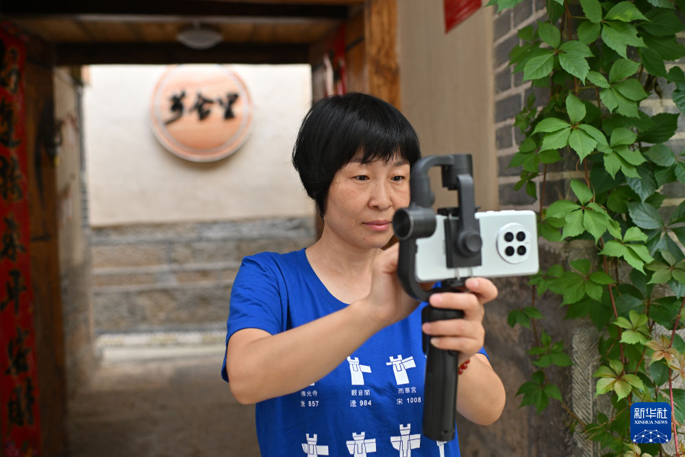 在山西省平顺县榔树园村,“新农人”魏美玲在民宿前准备手机直播(7月24日摄)。