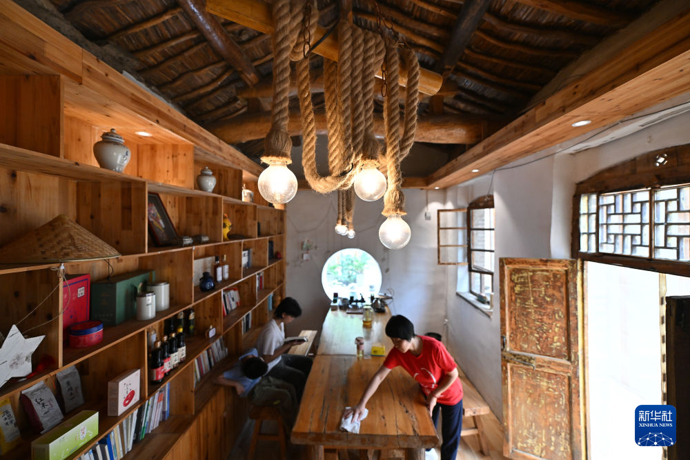 在山西省平顺县榔树园村,“新农人”魏美玲(右)在民宿的娱乐休闲室擦桌子(7月24日摄)。