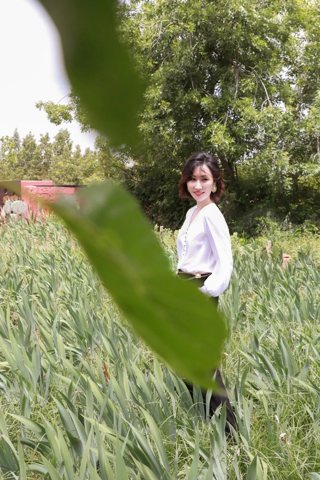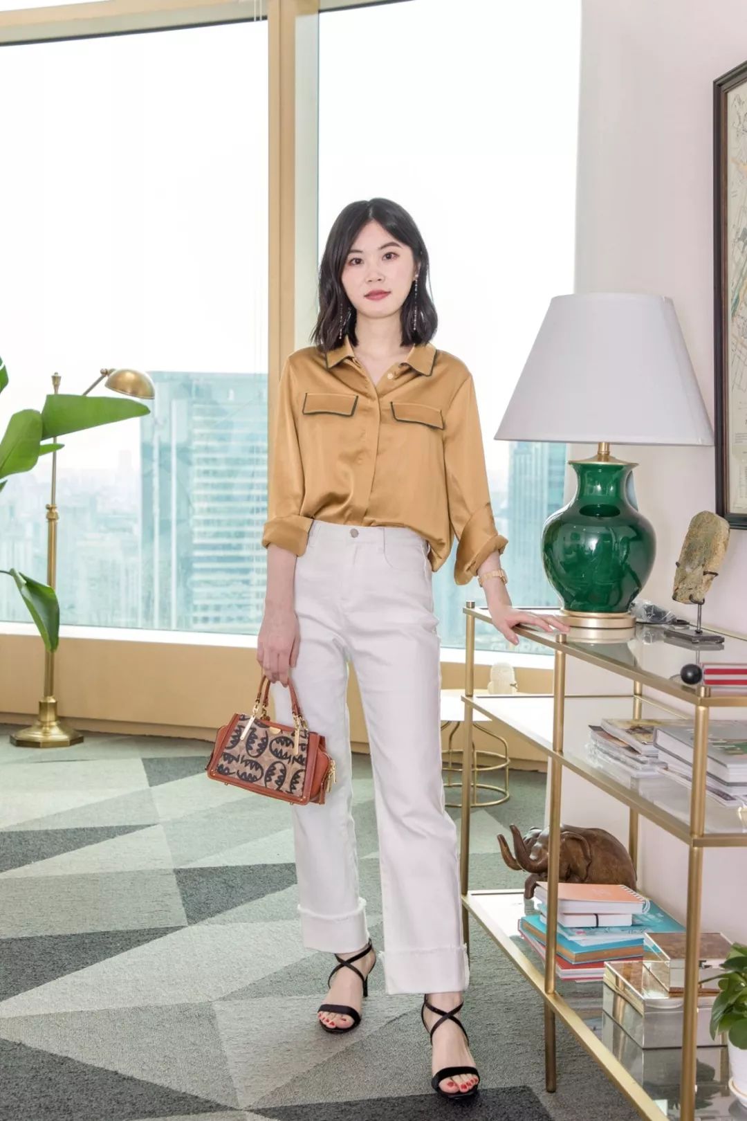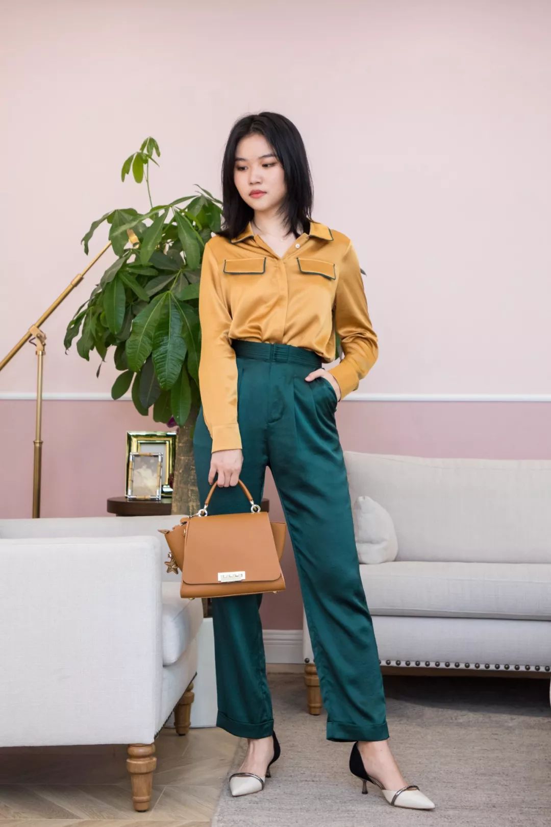 Lary搭配了绿色吸烟裤,呼应了衬衣上的绿,这一身配色复古有型,着装要求没那么严格的话,穿去上班也没问题。▼